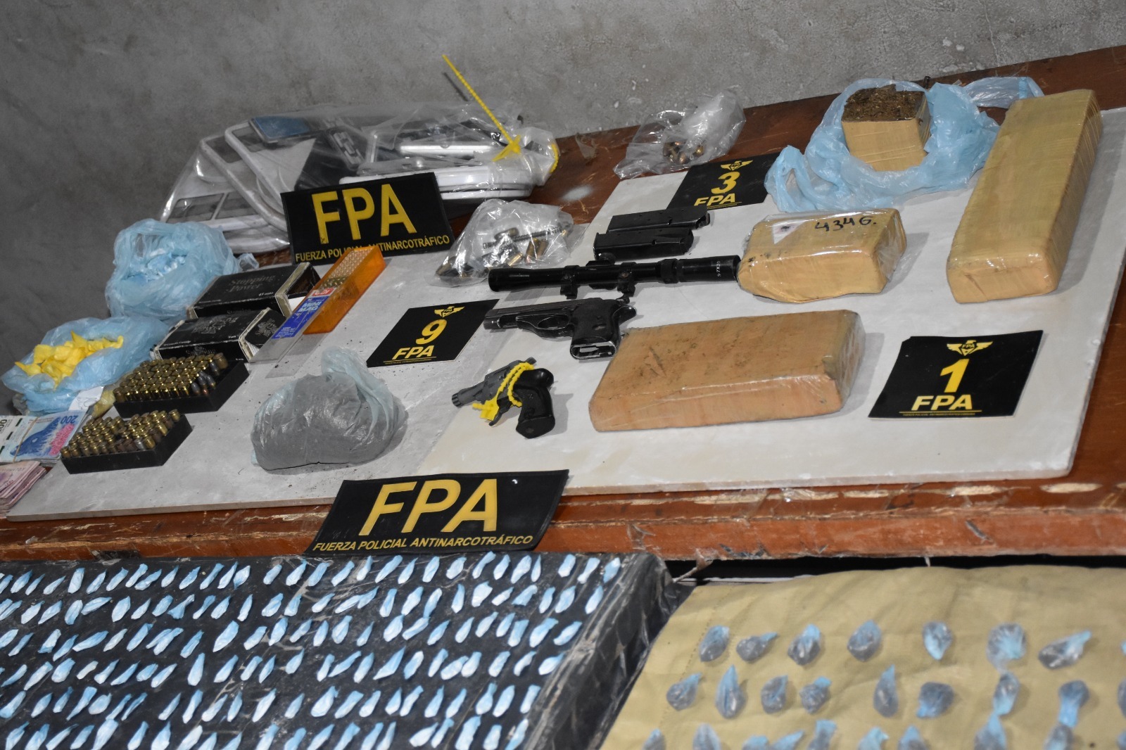 En los domicilios, se logró el secuestro de 14.436 dosis de cocaína y 9.986 de marihuana, siete plantas de cannabis sativa, dinero ($911.590), dos armas de fuego, un revólver, 166 cartuchos de distintos calibres, seis cargadores, una máquina de contar dinero, una mira telescópica y diferentes elementos relacionados a la causa.