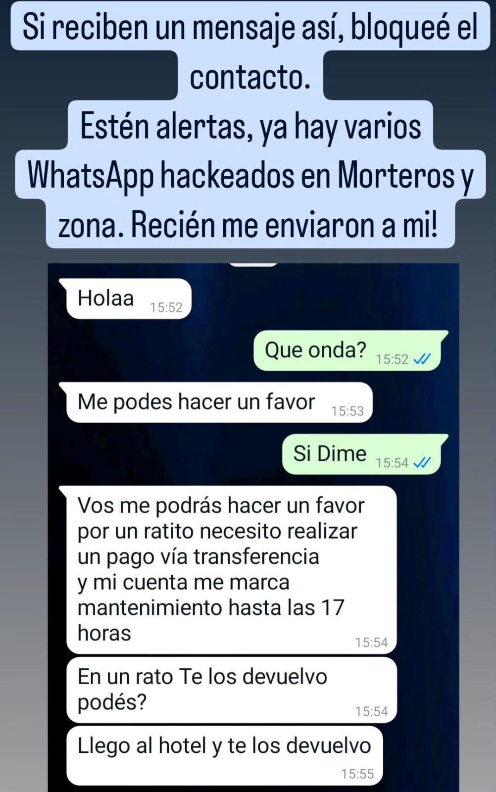 Ante casos reportados, un afectado lo publicó para evitar que sumen más afectados. Tras recibir un mensaje vía Whatsapp, se dieron cuenta que le habían hackeado la cuenta, para ello el afectado sumó la captura de la modalidad usada. “Solicitan a través de mensaje de whatsapp que les realicen la […]