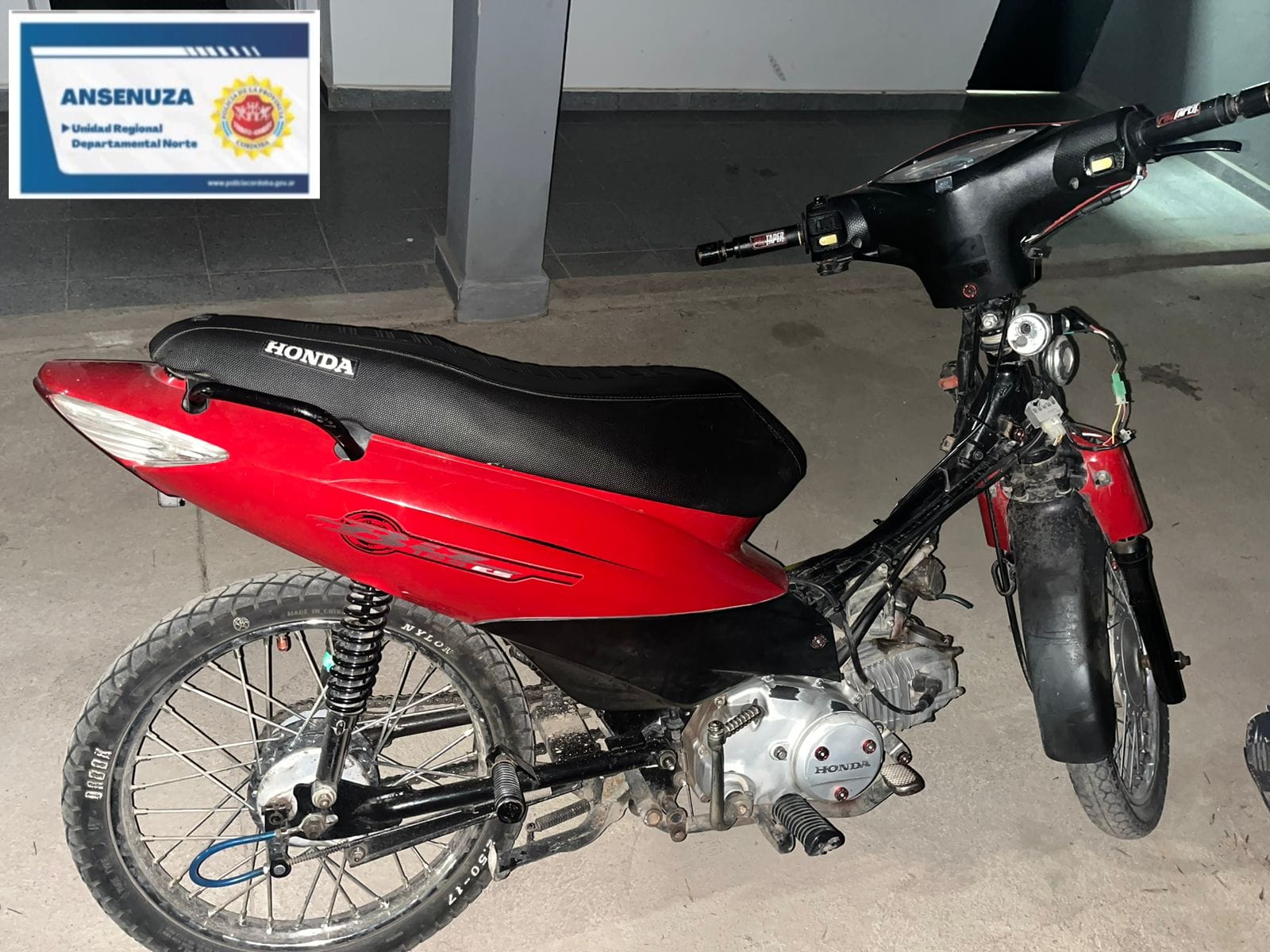 En intersección de calles Sarmiento y Madre Teresa de Calcuta se secuestró una motocicleta marca Honda Biz 110 de color roja, sin dominio, la cual carecía de medidas de seguridad, luces y era conducida por un menor de 17 años de edad.