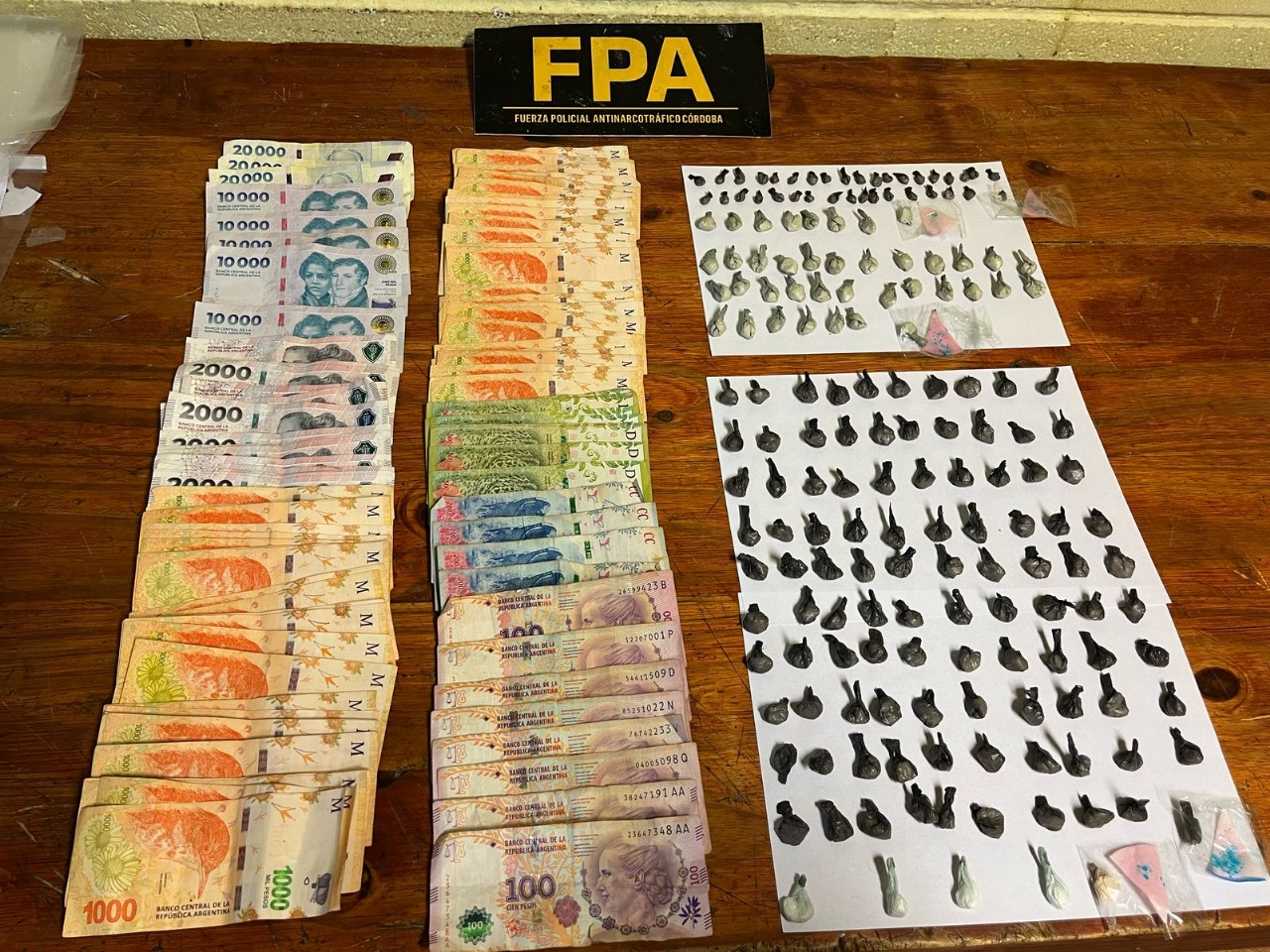 En los domicilios, con una extensa labor de los investigadores y los canes detectores de narcóticos, se secuestraron 1.600 dosis de cocaína y 120 de marihuana, dos ramas de cannabis sativa, pastillas de Rohypnol, dinero ($3.722.990 y 100 dólares), dos automóviles y diferentes elementos de fraccionamiento de sustancias ilícitas.